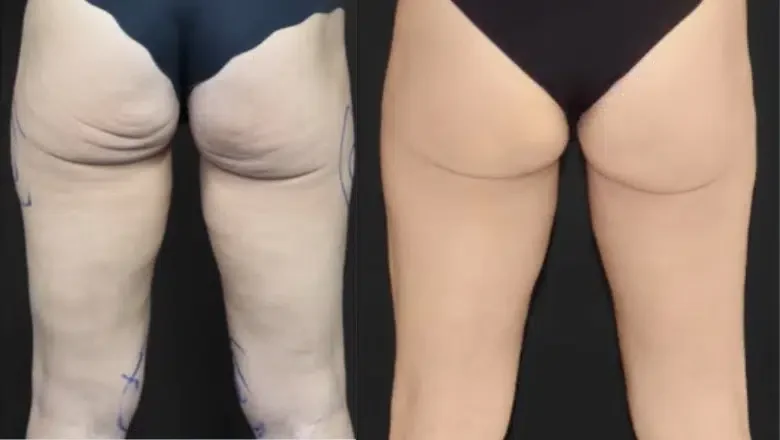 Sur le plan volumétrique, les résultats sont identiques à une liposuccion conventionnelle : réduction de 60-80% du volume des zones traitées, affinement majeur des cuisses, redessin des contours des jambes, disparition de la disproportion entre haut et bas du corps. Ces changements quantitatifs sont visibles dès le troisième mois.